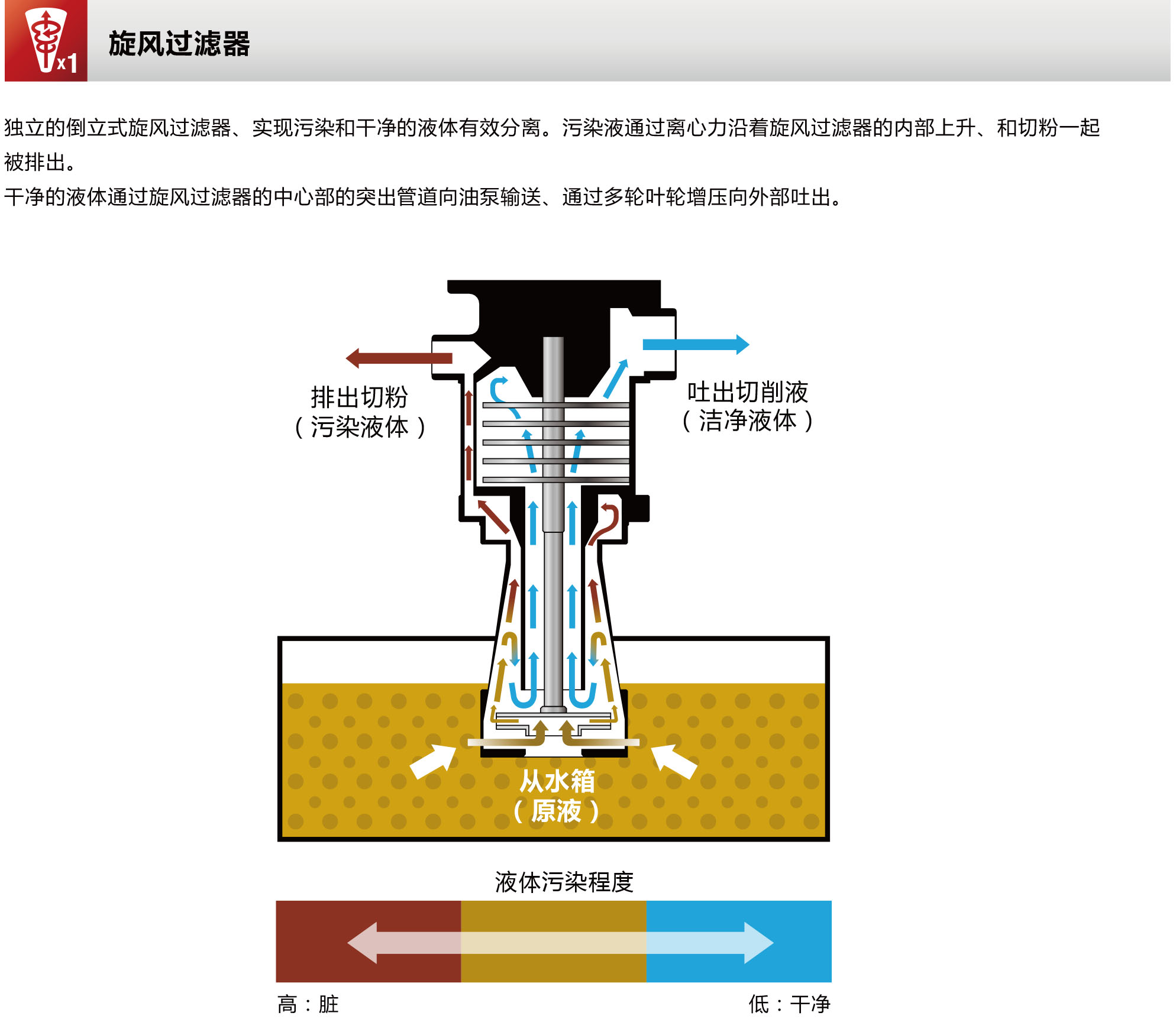 · 优势2:内置紊流过滤器,经常将附着于过滤器上的切粉进行清洗,不会堵塞过滤器的紧凑设计。
